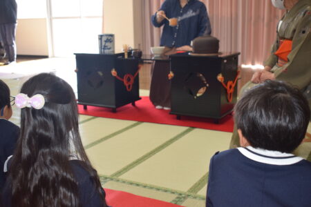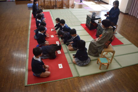 百田社中の皆様にお越しいただき、年長組さんがお茶会を体験しました。