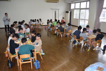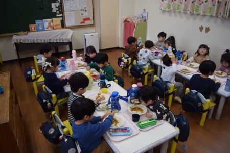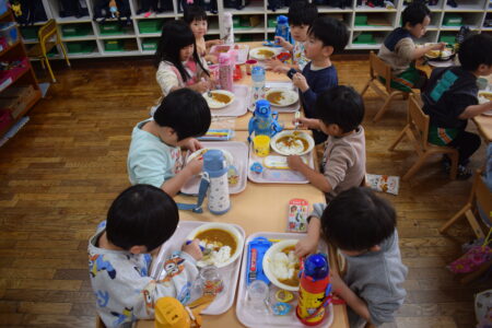 普段とは違う給食スタイルに園児さん達も、興奮しつつ、先生たちがついでくれるカレーをお腹いっぱい食べていました。